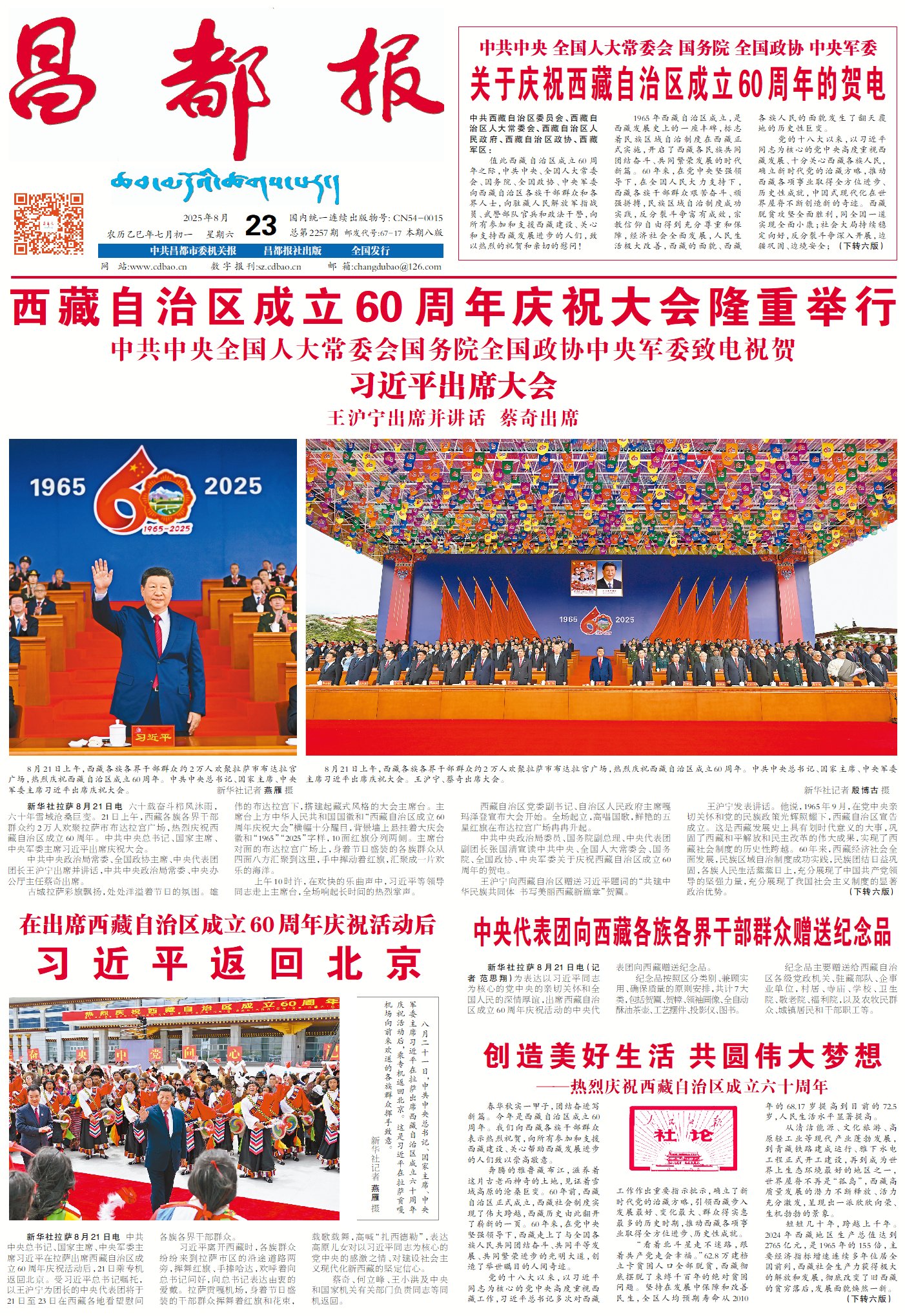 春華秋實(shí)一甲子,團(tuán)結(jié)奮進(jìn)寫(xiě)新篇。今年是西藏自治區(qū)成立60周年。我們向西藏各族干部群眾表示熱烈祝賀,向所有參加和支援西藏建設(shè)、關(guān)心幫助西藏發(fā)展進(jìn)步的人們致以崇高敬意。
